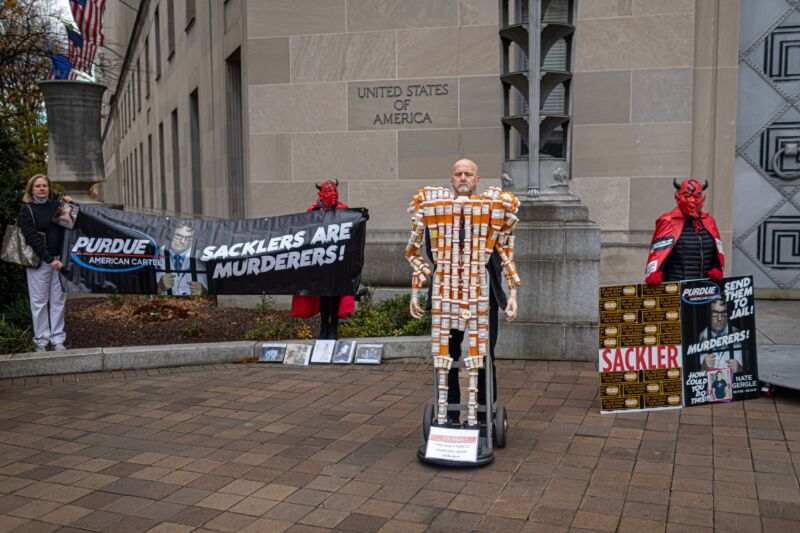 Enlarge / Frank Huntley, who raises awareness of opiate addiction with his sculpture “Pill Man,” is among protesters who rallied at the Department of Justice in Washington, DC, on December 3, 2021, calling on Attorney General Merrick Garland to bring criminal charges against members of the Sackler family. (credit: Getty Images | Pacific Press )