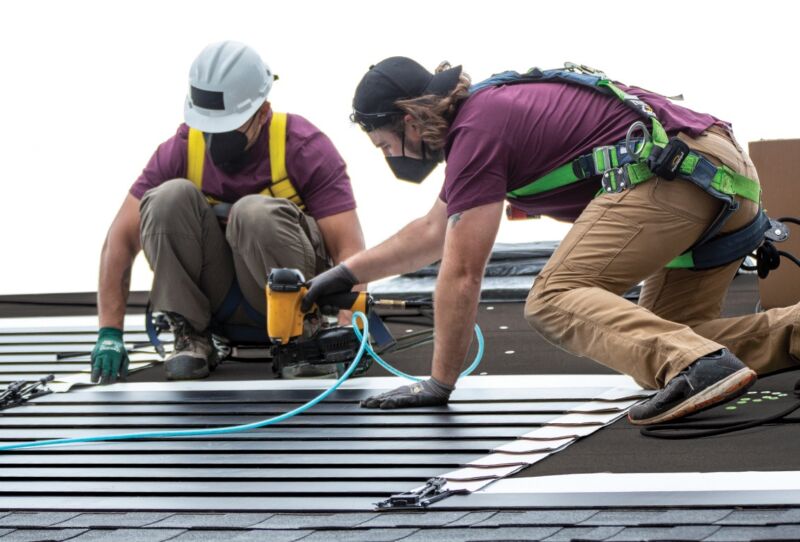 Enlarge / Installers nail GAF Energy’s new solar shingles to a demonstration house. (credit: GAF Energy)