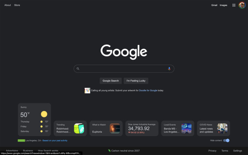 In the experiment, Google.com has a row of six cards at the bottom of the page. There’s weather, trending searches, “what to watch,” a stock card, local events, and COVID news. Clicking on a card will either expand it or load a search-results page. There’s also a “hide content” switch, which will turn the cards off. All of this seems very similar to the Google.com app, which has a scrollable list of “discover” cards.