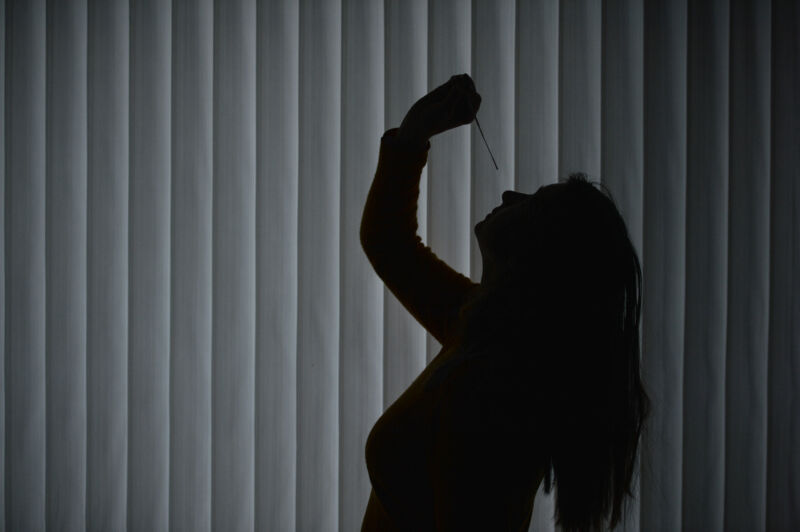 Enlarge / A woman takes a swab as part of a COVID-19 antigen rapid test. (credit: Getty | NurPhoto)