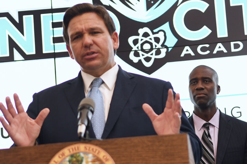 Enlarge / Florida Gov. Ron DeSantis speaks during a press conference before newly appointed state Surgeon General Dr. Joseph Ladapo at Neo City Academy in Kissimmee, Florida. (credit: Getty | SOPA images)