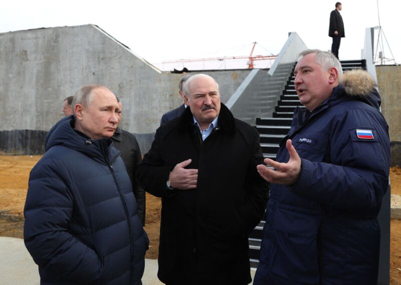 Enlarge / Roscosmos chief Dmitry Rogozin (right) speaks to Russia President Vladimir Putin (left) and Belarus President Alexander Lukashenko during their visit at the Vostochny cosmodrome on Tuesday. (credit: Mikhail Klimentyev/Sputnik/AFP via Getty Images)